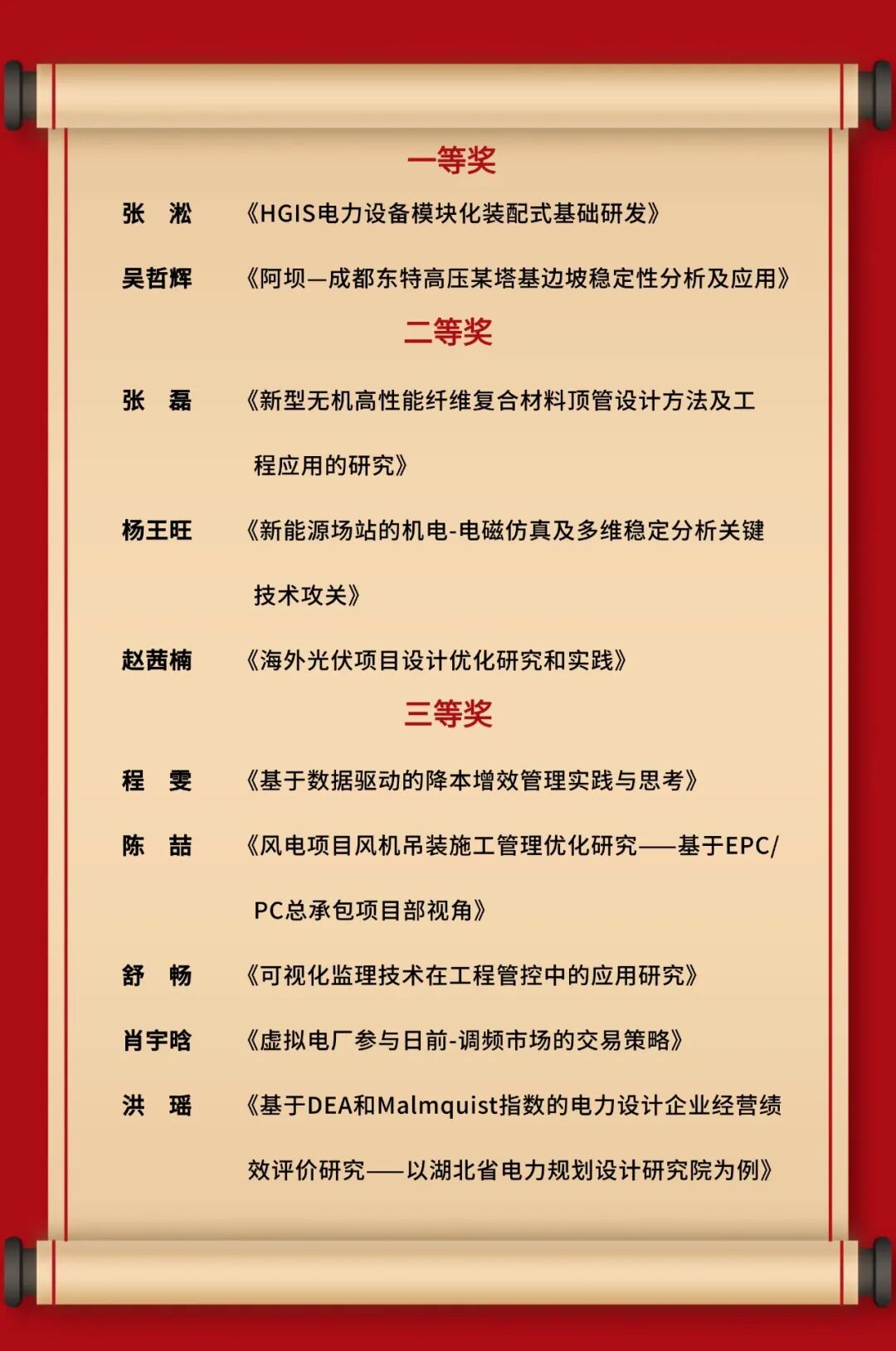 为进一步引领公司广大青年增强创新意识,提升创新能力,投身创新实践,在增强企业核心功能、提高核心竞争力中贡献青春力量,11月6日下午,公司工会、团委联合召开2025年青年(职工)论坛发布会。湖北工程公司团委书记徐卓知,公司党委副书记、纪委书记、工会主席周中桂出席发布会。 自青年(职工)论坛启动以来,公司团委积极动员,各部门、分子公司踊跃报名,累计征集论文21篇,初选出10篇论文在本次发布会上宣讲展示。发布会上,结合论坛主题和自身工作实际,10名优秀青年代表对论文成果进行了宣讲,以扎实的数据、清晰的逻辑和富有感染力的表达,全面展示了各自在专业领域的深度思考和研究成果。 现场专家评委从论文选题、演讲效果、创新水平、应用价值、现场表达等方面对发布成果进行了综合评分。最终,张淞的《HGIS电力设备模块化装配式基础研发》、吴哲辉的《阿坝—成都东特高压某塔基边坡稳定性分析及应用》荣获一等奖。 周中桂作总结讲话,高度肯定了本届青年(职工)论坛所取得的丰硕成果。他表示,要始终坚持党建带团建、团建促党建,以高质量党建引领青年工作高质量发展,为青年成长成才、担当作为筑牢根基。他对青年职工们提出三点要求:一要锤炼“勤学善思、知行合一”的过硬本领,在成长成才中扛起重任,在公司发展中实现个人价值。二要立足“降本增效、科技创新”的核心目标,在服务企业发展中找准定位,让创新成果真正转化为企业的竞争优势、发展优势。三要弘扬“敢闯敢试、求真务实”的创新精神,在破解发展难题中展现担当,为公司高质量发展贡献更多青春力量。 公司总经理助理、副总工程师,人力资源部、党群工作部相关人员参加会议。 获奖者介绍 一等奖获得者 张淞,30岁,现任电网分院总图主设人,主要负责变电站总图专业设计。参与过天门500千伏变电站新建工程、江北500千伏变电站新建工程、宜昌紫盖寺220千伏变电站新建工程等多个电网项目。 吴哲辉,26岁,现任勘测分院岩土处设计师。参与过宜昌紫盖寺220千伏变电站新建工程可研勘察,荆门东500千伏变电站新建工程边坡支护施工图设计,夷陵500千伏变电站边坡支护施工图设计。 二等奖获得者 张磊,29岁,现任电网分院线路结构处设计师。担任输电线路项目主设人,主要负责线路结构设计工作。参与过大唐中卫风电外送、荆门东220千伏、喀什变220千伏等多条输电线路工程设计。 杨王旺,27岁,现任规划分院系统规划处设计师。担任输变电及新能源接入系统与安稳专题项目的主设人,主要负责输变电工程及新能源项目的接入系统方案设计及相关安全稳定计算工作。参与过随州百万千瓦新能源基地、仙桃百万千瓦新能源基地等安全稳定专题研究。 赵茜楠,31岁,现任新能源分公司资源规划处设计师,主要负责光伏项目的设计工作。参与过印度尼西亚巴淡漂浮光伏项目、赞比亚卢森发光伏发电项目、内蒙古呼和浩特托清经济开发区光伏项目等设计工作。 三等奖获得者 程雯,33岁,现任市政建筑分公司市场经营处经营专责,主要负责分公司经营指标统计分析等经营管理类工作。参与配合过东山柏泉片区经济干线改扩建工程勘察设计施工总承包项目、荷沙线(东柏路至汉北河桥)改扩建工程勘察设计施工总承包等多个投标工作。 陈喆,32岁,现任项目管理中心苏尼特右旗15万千瓦风电项目的项目经理,负责项目履约工作。参与过大唐阿拉善盟乌力吉400兆瓦风电项目、华能额尔格图70兆瓦风电项目、湖北华电大金武穴二期50兆瓦风电项目等多个项目。 舒畅,30岁,现任监理公司技术质量部副主任,主要负责技术质量管理。参与过卡麦±400千伏换流站工程、白鹤滩-江苏±800千伏线路工程等多个特高压项目监理工作。 肖宇晗,25岁,现任数字化分公司电网三维设计师,主要负责电气三维设计工作。参与过中煤鄂尔多斯变电站三维设计、新型电力系统下云边端协同的虚拟电厂科技项目、咸宁院人工智能生成可研报告等多个项目。 洪瑶,27岁,现任技经中心造价师,主要负责新能源项目造价工作。参与过赞比亚卡富埃100兆瓦光伏项目、新疆华电塔城和布克赛尔县105万千瓦风电项目、苏尼特右旗西二站1000兆瓦/4000兆瓦时新型储能等多个项目造价工作。 | |