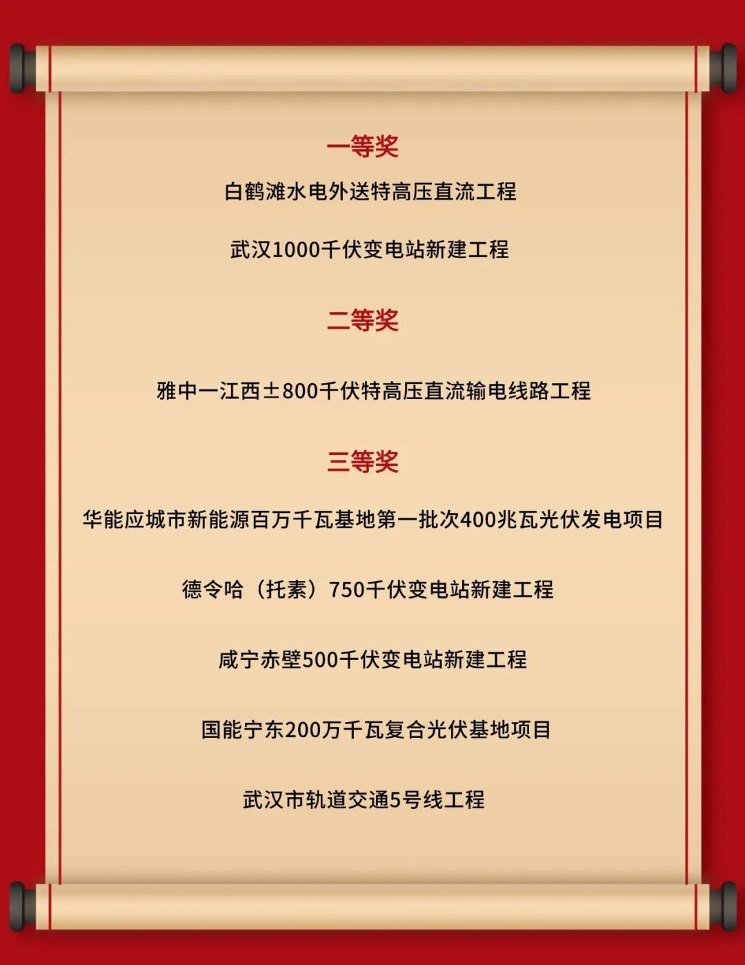 12月1日 从中国勘察设计协会获悉 公司8项成果喜获中国勘察设计协会 全国优秀工程勘察设计奖 一等奖2项、二等奖1项、三等奖5项 本次公司获奖项目数量取得历史性突破 且在全国电力勘测设计企业中排名第一 充分展现了公司在勘测设计领域的 卓越实力与领先水平 全国优秀工程勘察设计奖每两年开展一次评审,旨在通过树立高标准、高质量的行业典范,推动整个勘察设计行业持续提升技术水平和创新能力,为国家经济建设和社会发展提供更优质、更先进、更可持续的工程技术服务。 近年来,公司持续深耕电网勘测设计、新能源领域,不断推动技术融合与工程创新。在电网勘测设计中,依托数字化技术精准洞察复杂环境,大幅提升勘测效率与精度;运用智能变电站技术实现设备集成与运维模式革新,并在特高压输电领域攻克关键技术,高质量交付多项跨区域骨干通道工程。在新能源领域,充分发挥设计施工一体化优势,引领多项大型风电、光伏基地建设,为行业高质量发展持续注入强劲动能。 本次获奖,是行业对公司深耕电力工程领域综合实力的高度认可。公司将以此为新起点,继续专注现代智能电网建设,积极投身风电、光伏等新能源领域,持续以高质量设计成果助推能源结构转型升级,为国家电力事业高质量发展贡献力量! 获奖成果介绍 一等奖 白鹤滩水电外送特高压直流工程 白鹤滩水电外送特高压直流工程是国家“西电东送”战略部署的重点工程,也是促进国家能源结构调整和节能减排的重大清洁能源项目。作为国家电网公司首个三维正向设计试点应用特高压工程,选取典型区段开展全专业、全过程数字化设计,有效推动特高压数字化成果在项目全寿命周期内的综合应用;首次在特高压直流线路推广应用山地微型桩基础,提高山区线路机械化施工水平;首次全线排查“两大”“两微”区段,精准校核、强化设计,保障线路安全稳定运行。工程建成后,将世界第二大水电站白鹤滩水电站的清洁水电送往国家东部沿海地区,每年输电超600亿千瓦时。 武汉1000千伏变电站新建工程 武汉1000千伏变电站新建工程是华中“日”字型特高压交流环网的重要组成部分。工程统筹兼顾交直流合建要求,开展全寿命周期设计,优化运维安全和效率提升方案,实现工程建设高效推进;在500千伏母线设计中预留分段措施,为后续系统发展预留空间。工程建成后,有力推动了湖北省电网向送受端并存、交直流混联的大电网转型升级,大幅提升湖北省与周边省份的电力互济能力。 二等奖 雅中一江西±800千伏特高压 直流输电线路工程 雅中一江西±800千伏特高压直流输电线路工程是服务国家“西电东送”战略、保障西部水电消纳、满足中东部地区绿色发展需求的重大输电项目。工程全面攻克了高海拔地区直流外绝缘选型、高抗震地区直流设备关键技术等难题,面对沿线复杂的地形条件,通过索道运输及机械化施工设计、抗冰及差异化设计等,在保障工程安全可靠的前提下,实现了成本合理控制。工程建成后,对于落实“双碳”目标、推动四川省清洁能源电力开发外送、保障华中电力安全可靠供应、拉动经济增长等方面具有重要意义。 三等奖 华能应城市新能源百万千瓦基地第一批次 400兆瓦光伏发电项目 华能应城市新能源百万千瓦基地第一批次400兆瓦光伏发电项目是湖北省首批建设、全容量投产的新能源百万千瓦基地项目,也是湖北省最大的农光互补项目。作为打造“板上发电、板下种植”“上面发电、下面养鱼”的新农村发展示范项目,实现“一种资源、三个产业”集约发展模式。创新采用“一体化集成汇流”、电缆故障预警在线监测等新技术,应用无人机、机器人实现光伏电站智能化管理。应用光伏建筑一体化(BIPV)技术,配置光伏发电车棚、微型储能、充电桩搭建微电网自循环系统。 德令哈(托素)750千伏变电站新建工程 德令哈(托素)750千伏变电站新建工程是青海省电网提升能源输送能力的重点工程。工程首创应用的750千伏混合气体绝缘开关设备(HGIS)配电装置C型布置方案被国家电网公司纳入通用设计方案;在750千伏配电装置中采用该电压等级全国最长悬吊管母设计;依托变电站深入开展装配式建设技术、750千伏配电装置及联合构架关键技术等课题研究,为相关领域技术创新提供有力支撑。工程建成后,有效推进了青海省西部“8”字型坚强电网建设,助力海西地区新能源规模化开发与外送,有力强化了青海省能源输送关键断面,提升了区域能源保供能力。 咸宁赤壁500千伏变电站新建工程 咸宁赤壁500千伏变电站新建工程是湖北省电网建设的重要工程。工程在国内首次实现500千伏电压等级混合气体绝缘开关设备(HGIS)基础的装配化建造,显著提高全站装配率和建设效率;在湖北省内首次在220千伏气体绝缘组合电器设备(GIS)中试点应用全氟异丁腈(C4)环保气体,有效减少碳排放;依托变电站深入开展装配式建设体系、模块化施工关键技术、绿色低碳构筑物基础装配式建造关键技术等课题研究,为电网工程绿色化、工业化建设积累了宝贵经验。 国能宁东200万千瓦复合光伏基地项目 国能宁东200万千瓦复合光伏基地项目是全国首批1亿千瓦大型风电光伏基地项目之一,是宁夏“西电东送”重要绿色能源基地。项目按照“数字设计、智慧运维,远程监控、少人值守,多能互补、低碳高